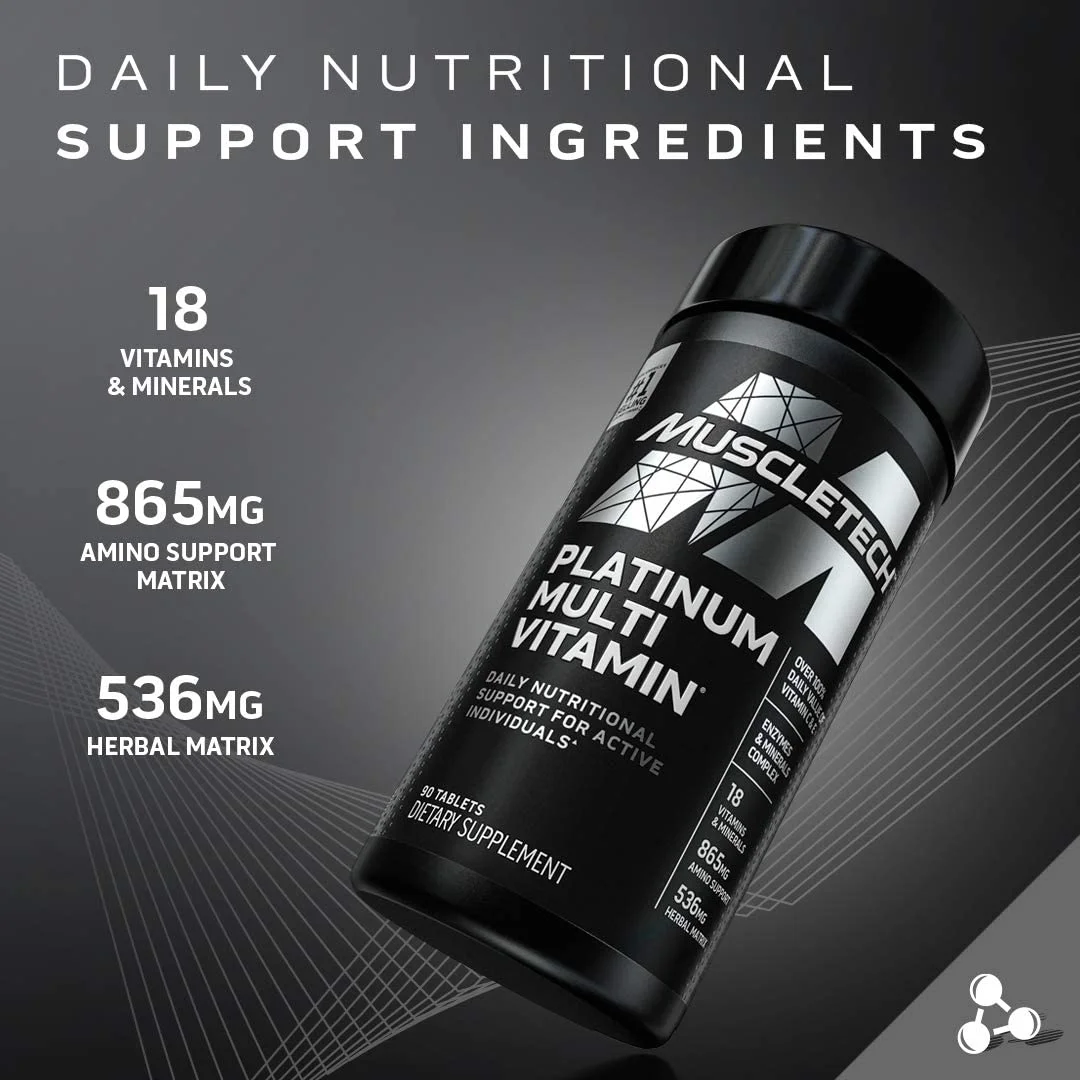 بلاتينيوم ملتي فيتامين من ماسل تك هو مكمل شامل للرياضيين يدعم الطاقة والمناعة والاستشفاء، ويعوض نقص الفيتامينات والمعادن للحفاظ على أداء قوي طوال اليوم.